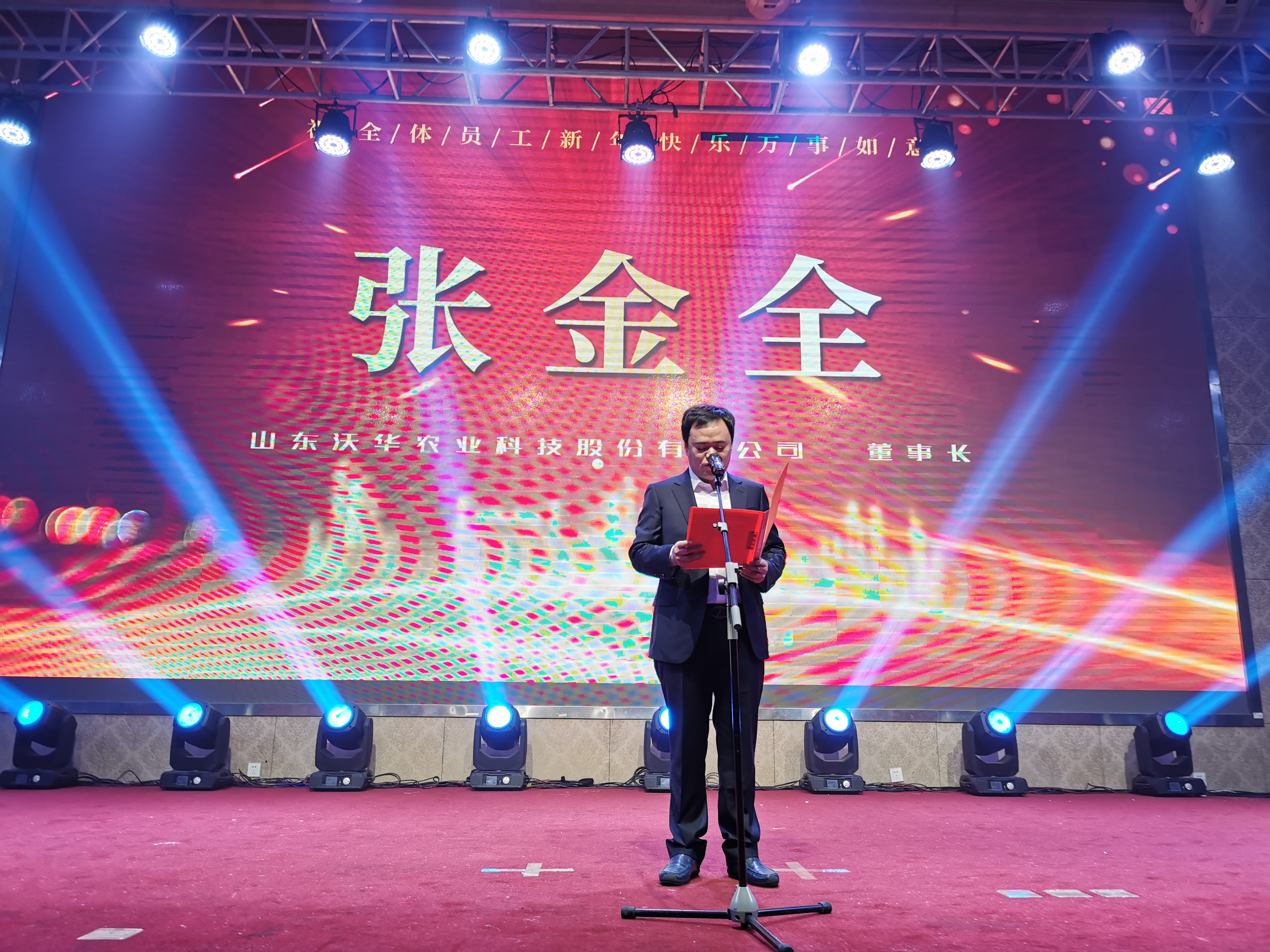 律回春晖渐,万象始更新。2020年1月15日,山东沃华农业科技股份有限公司2020年春节年会在安丘市新东方大酒店隆重拉开帷幕。围绕“追梦、奋进、再出发”的年会主题,公司董事长张金全、总经理张笑笑、公司中高层管理人员、公司员工及各地区客户齐聚一堂,总结过去一年取得的成绩,谋划新一年的发展方向。