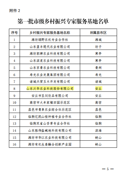 2021年11月29日,濰坊市人力資源和社會保障局公布了關于第一批市級專家服務基地和市級鄉村振興專家服務基地的通知,山東沃華農業科技股份有限公司喜獲第一批市級鄉村振興專家服務基地稱號。集聚創新資源、突破關鍵技術、優化產業結構,沃華農業將持續為新舊動能轉換工程和鄉村振興助力加油!