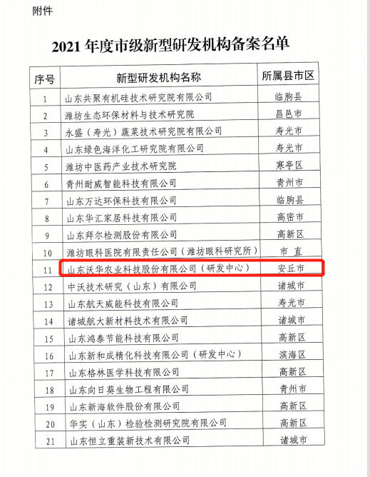 凡是過往皆是序章,所有將來皆為可盼。在2021年即將結束之際,沃華科技又迎來了新的榮譽,為今年的工作劃上了一個圓滿的句號。2021年12月31日,濰坊市科學技術局公布了關于2021年度市級新型研發機構備案名單,沃華科技研發中心榜上有名。